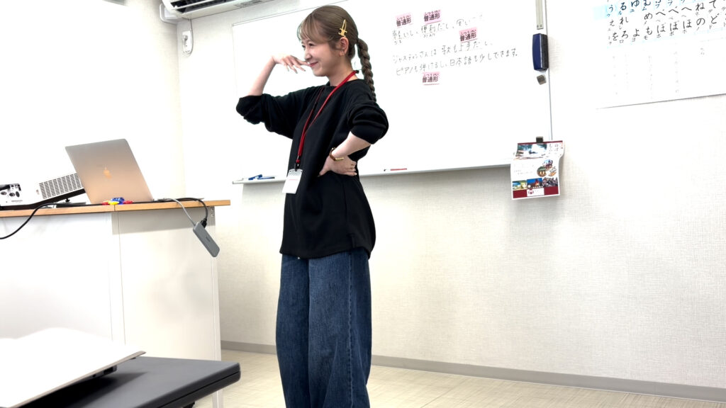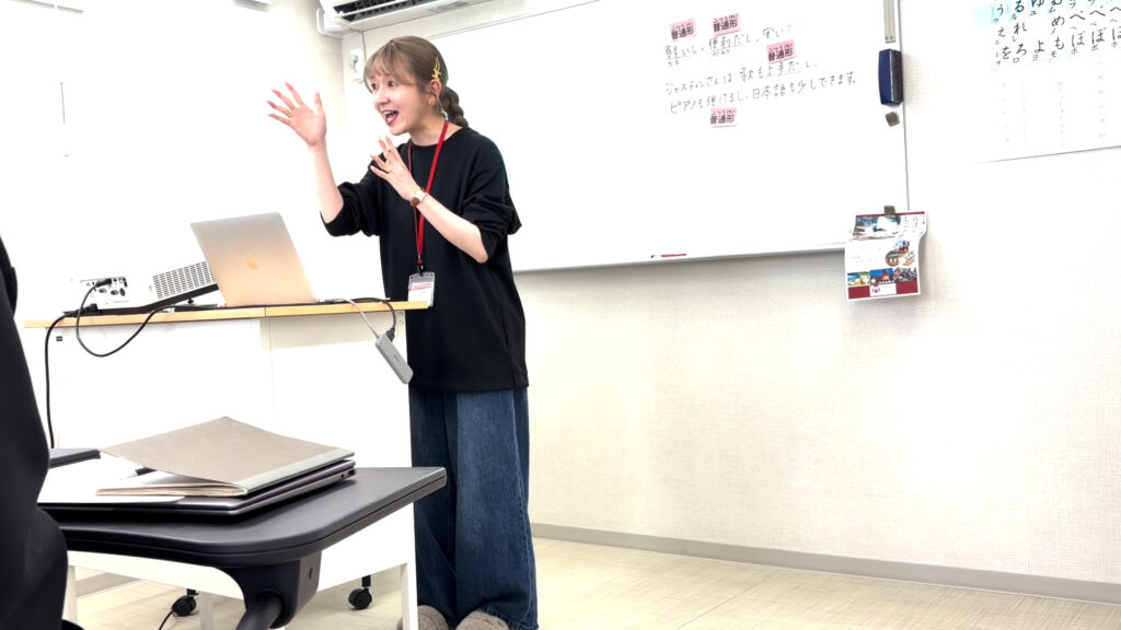 久保:私の基本的な授業の流れは基本的な文型を導入して、板書して、口頭練習をして、絵カードの練習をして、自分で文を作る練習をして活動するというもので、これは10何年前と何も変わっていません。ただ、その都度、教科書は違うので、教科書によってもスタイルが変わります。最近は生成AIが発達しているので、便利な反面、著作権には気を使わなくてはいけなくなりました。N1グランプリの際も著作権に関しては細かい注意があり、普通の授業であればパワポに貼れるものも、N1グランプリでは使えなかったんです。例えばジャスティン・ビーバーの写真をここで使いたいけれど、肖像権の問題があるとなると、生成AIにジャスティン・ビーバーそっくりのイラストを描いてもらい、目のところにモザイクをかけたりしました。でも実際の授業では10年前は何でも自分で描かないといけなかったところが、今は生成AIのお蔭で「ここが気に入らないなあ」という箇所はシンプルに修正ができますし、それができるのは10年前と違うところだと思います。